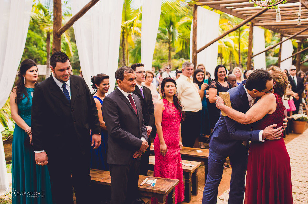 O noivo fez uma surpresa para os seus pais no meio do casamento, eles estavam fazendo 40 anos de casados naquele dia e foram chamados ao altar com direito a presentes, a mãe ganhou um lindo anel e o pai um escapulário. Fizeram parte também da cerimônia os avós da Cintia que levaram as alianças. O apoio e participação da família dos noivos no casamento e em todos os detalhes foi essencial e refletiu no lindo resultado.