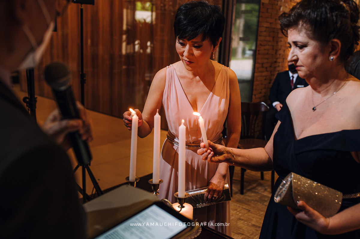 Não houve entrada dos padrinhos, somente dos pais e dos noivos, que mesmo se vendo antes, dava para ver no olhar de ambos a admiração e felicidade em reafirmar esse amor. Os votos foram lindos e a emoção tomou conta da família ao ver o casal dizer o Amém para a vida a dois. A terceira vela foi acesa pelo casal para completar a união.