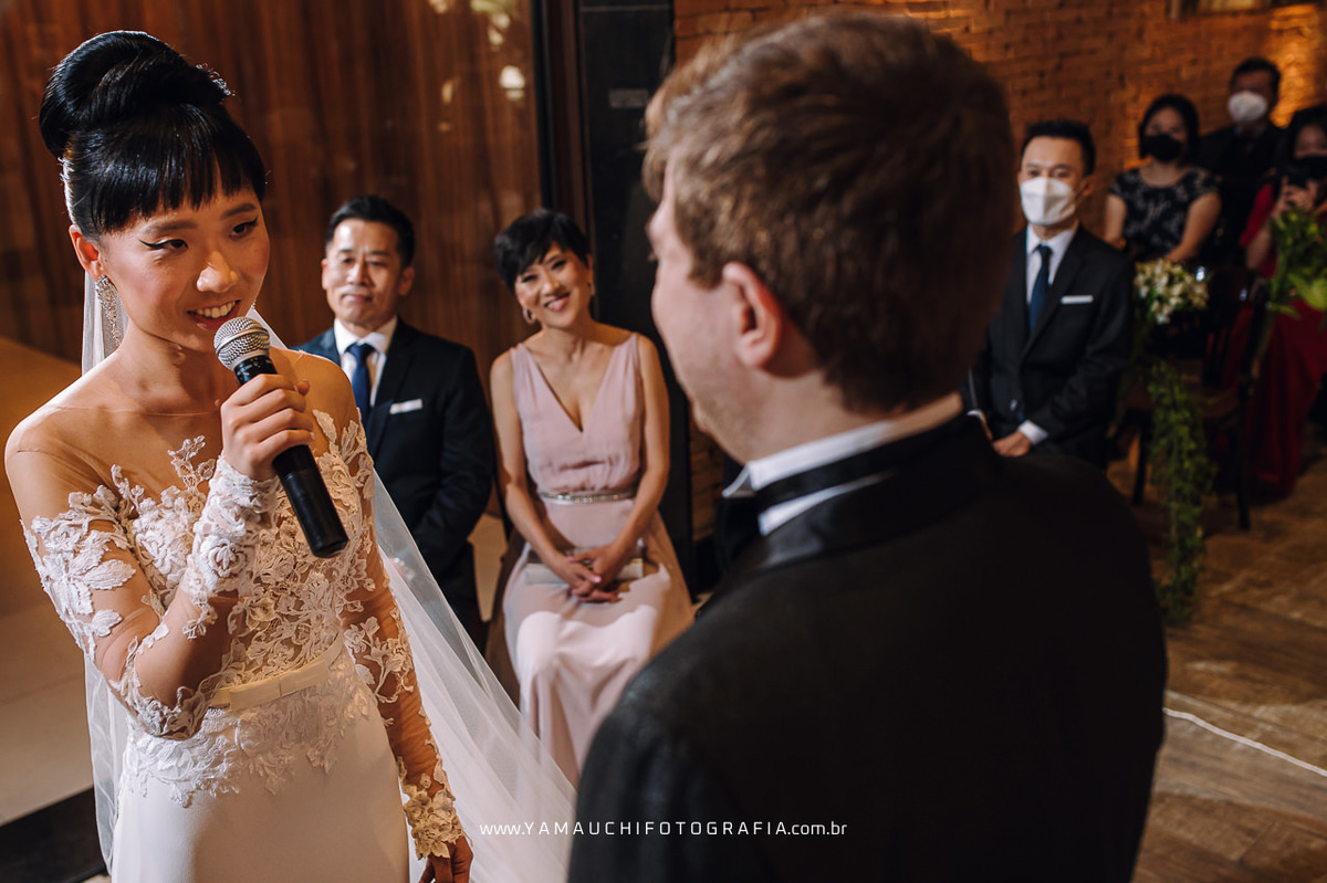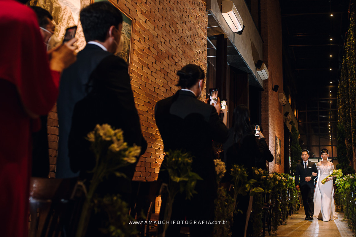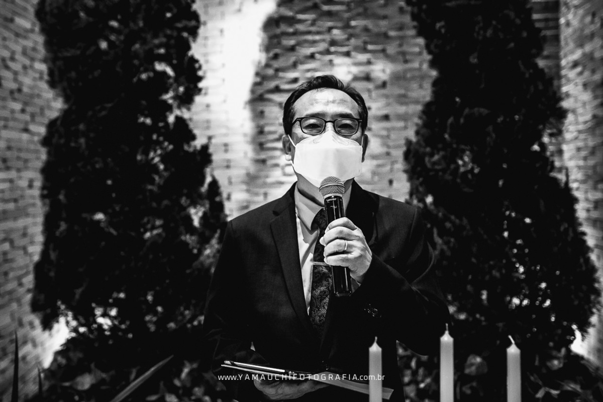 A cerimônia foi decorada com muito verde e pinheiros enormes, foi uma cerimônia evangélica que contou também com palavras em coreano e votos personalizados dos noivos. No altar as mães acenderam velas para simbolizar a união das duas famílias.