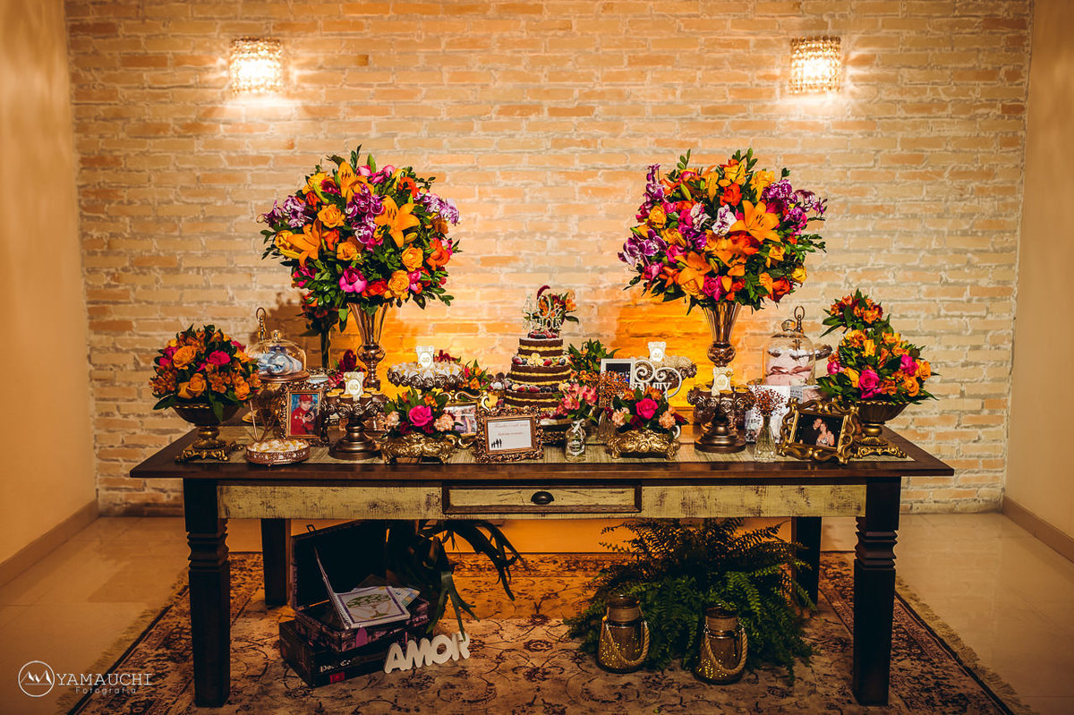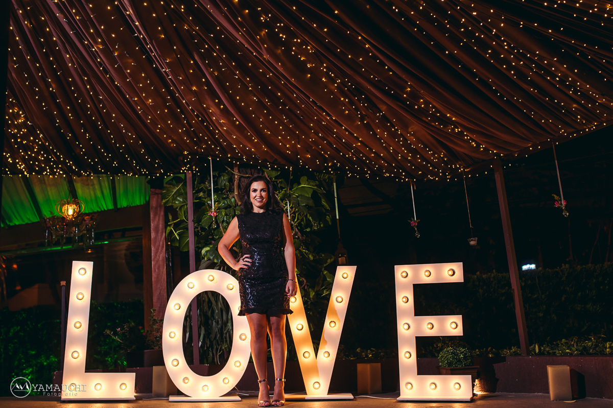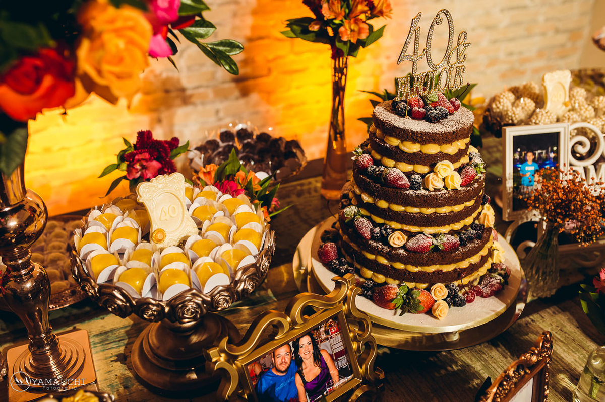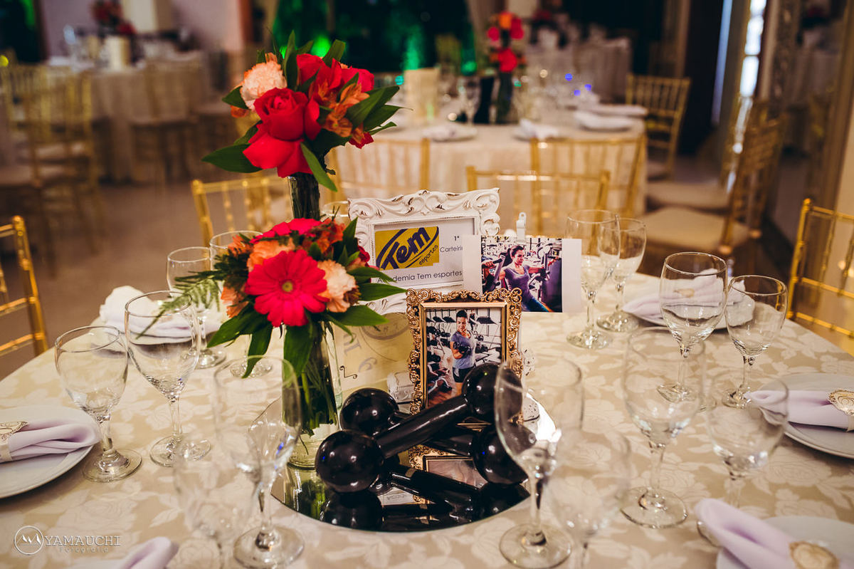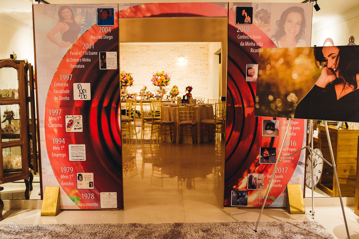 A decoração da festa foi o túnel do tempo, desde o nascimento até os dias de hoje, com direito a muitos relógios, uma árvore linda de recados, um letreiro escrito love na entrada bem grande, muitas flores e é claro não podia falta a parte fitness. Tudo muito lindo e de bom gosto.