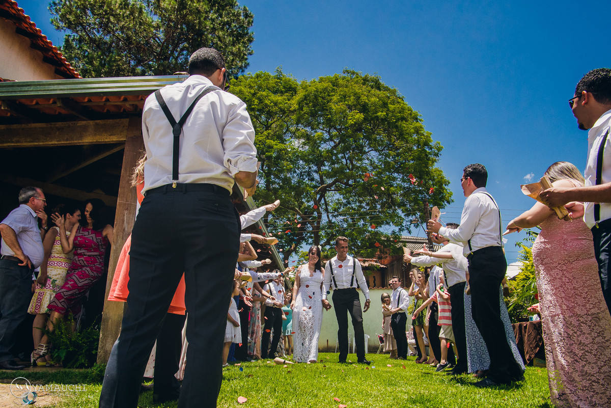 Para finalizar e abençoar esse dia terminamos o casamento com uma chuva repentina e saímos sob aplausos dos amigos, uma reação inesperada que nos emocionou e encheu nosso coração de gratidão.